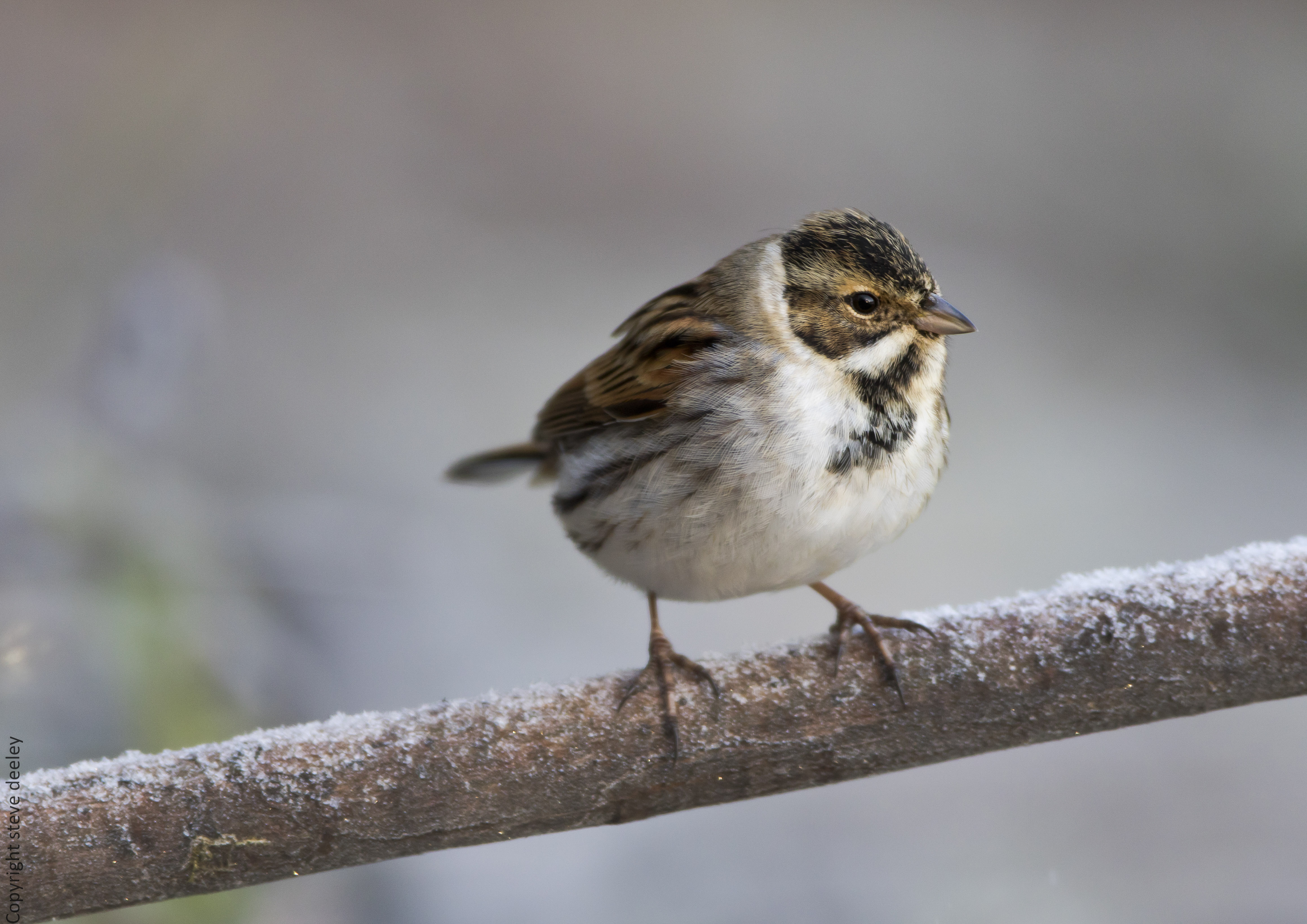 Male reed bunting on frosty branch