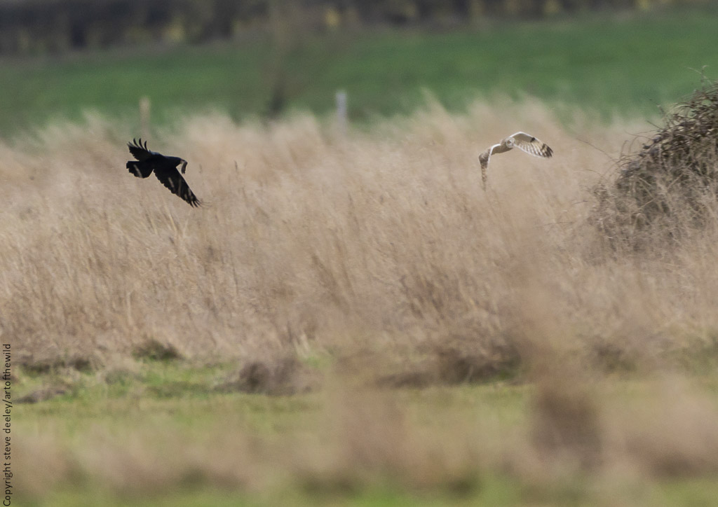Crow snatches vole from short eared owl