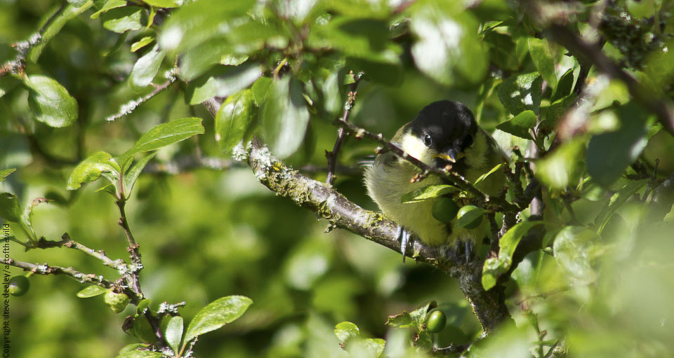 Fledgling Grate Tit hiding in hawthorn