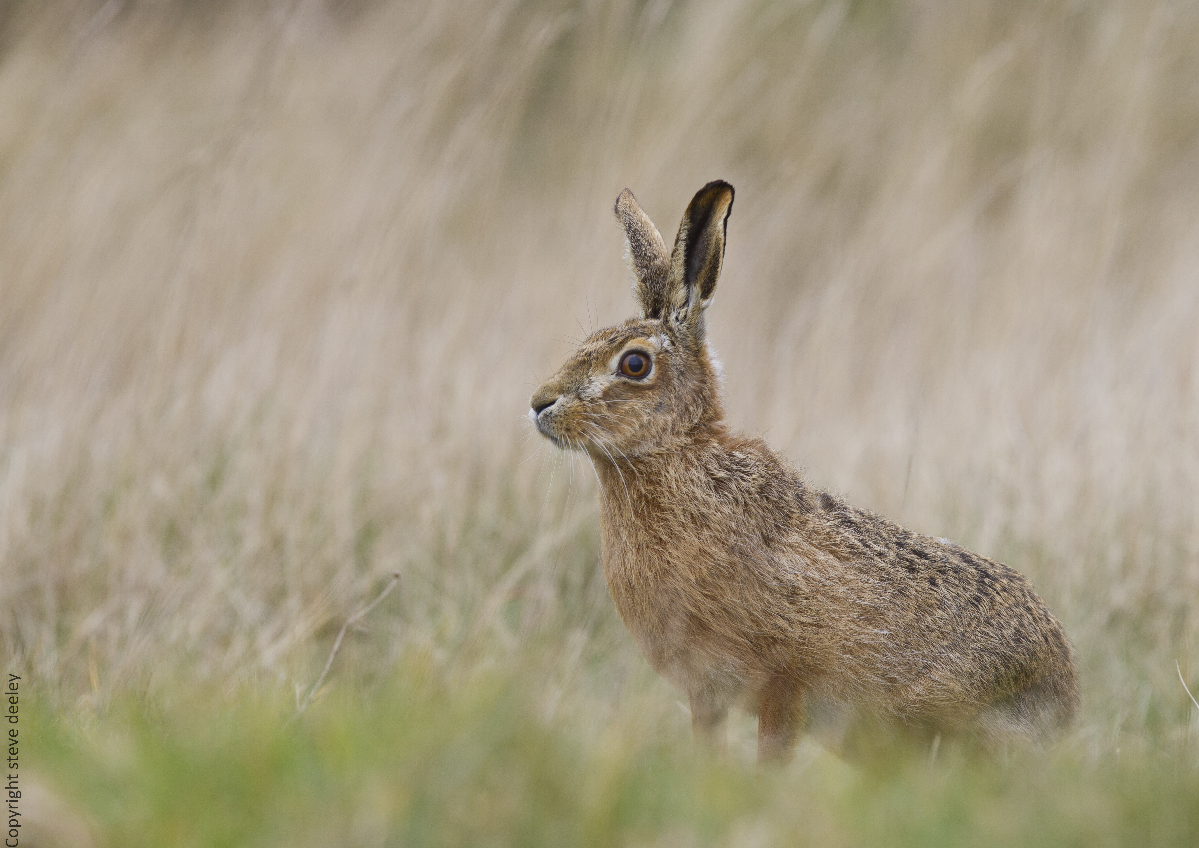 Brown Hare posing alert in grassland
