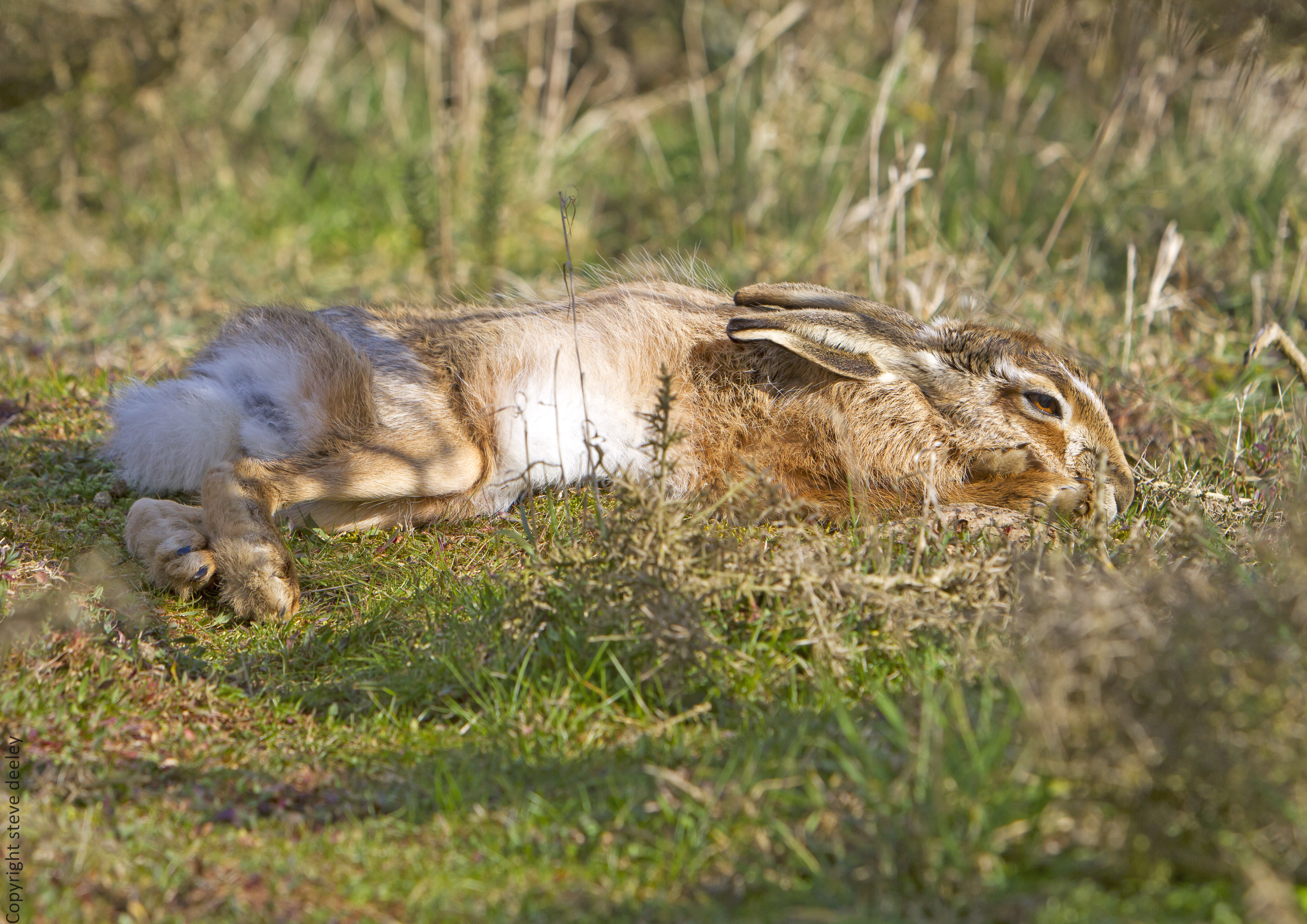 Brown Hare [common hare] Lepus Europaeus lying flat basking in spring sunshine